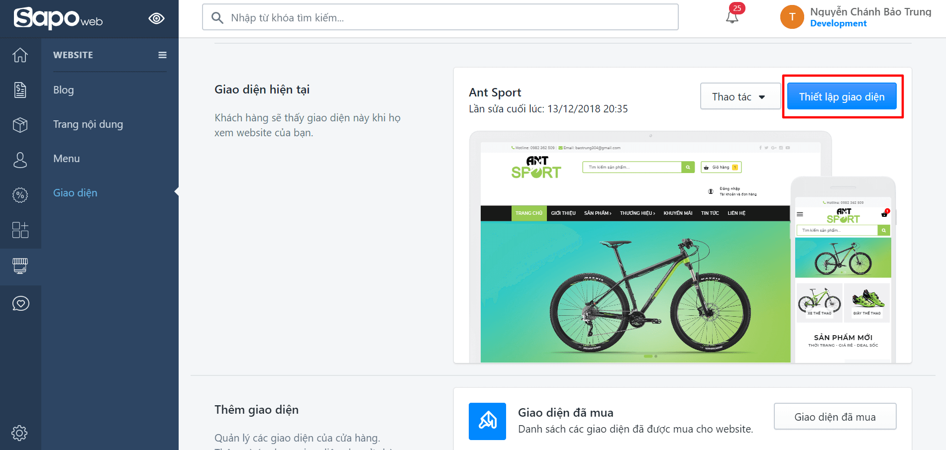 Sau khi cài đặt theme mới lên cửa hàng, bạn bấm vào THIẾT LẬP GIAO DIỆN để tùy chỉnh theme:
