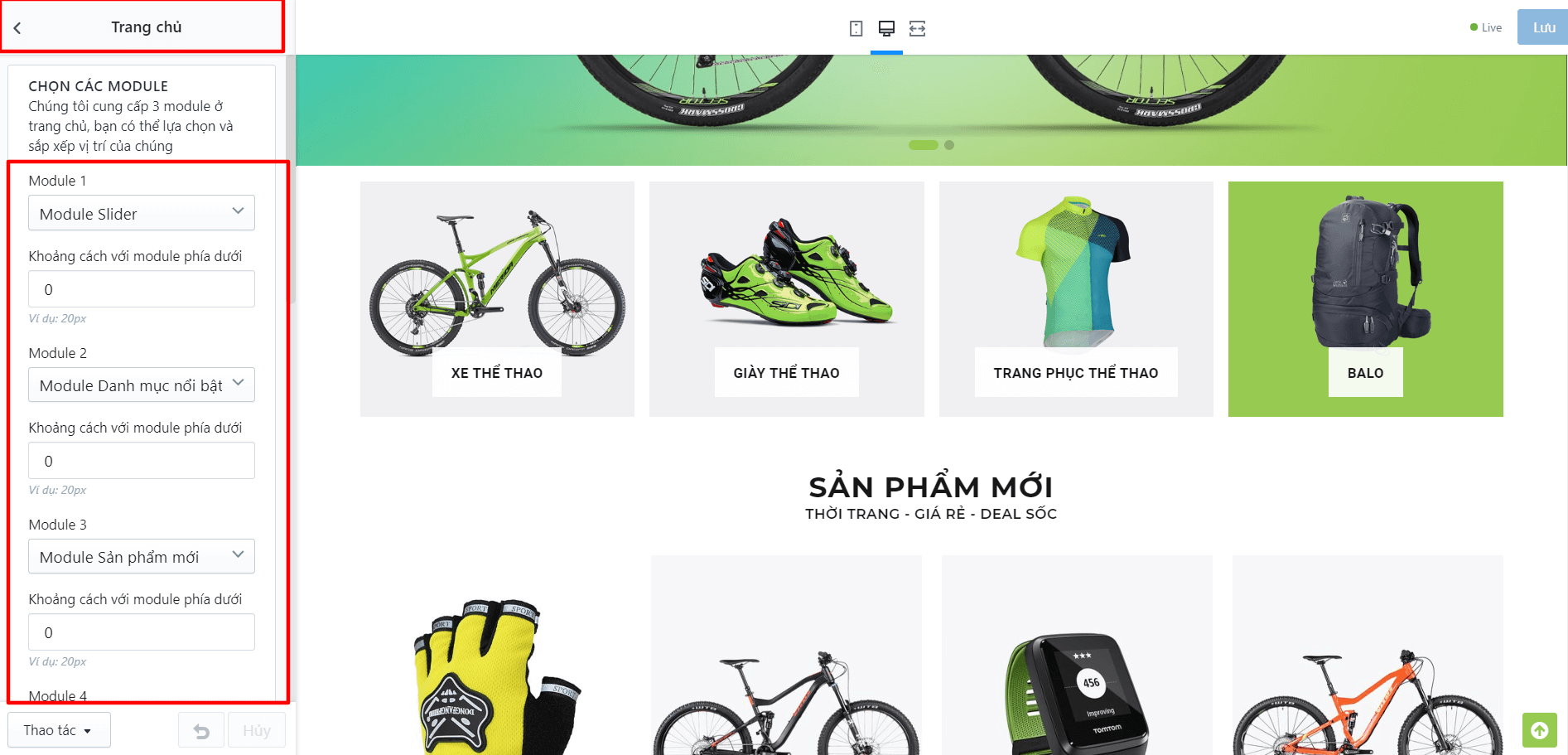 Trên trang chủ, chúng tôi chung cấp 6 module cho phép bạn có thể lựa chọn và sắp xếp vị trí của chúng trên trang chủ
